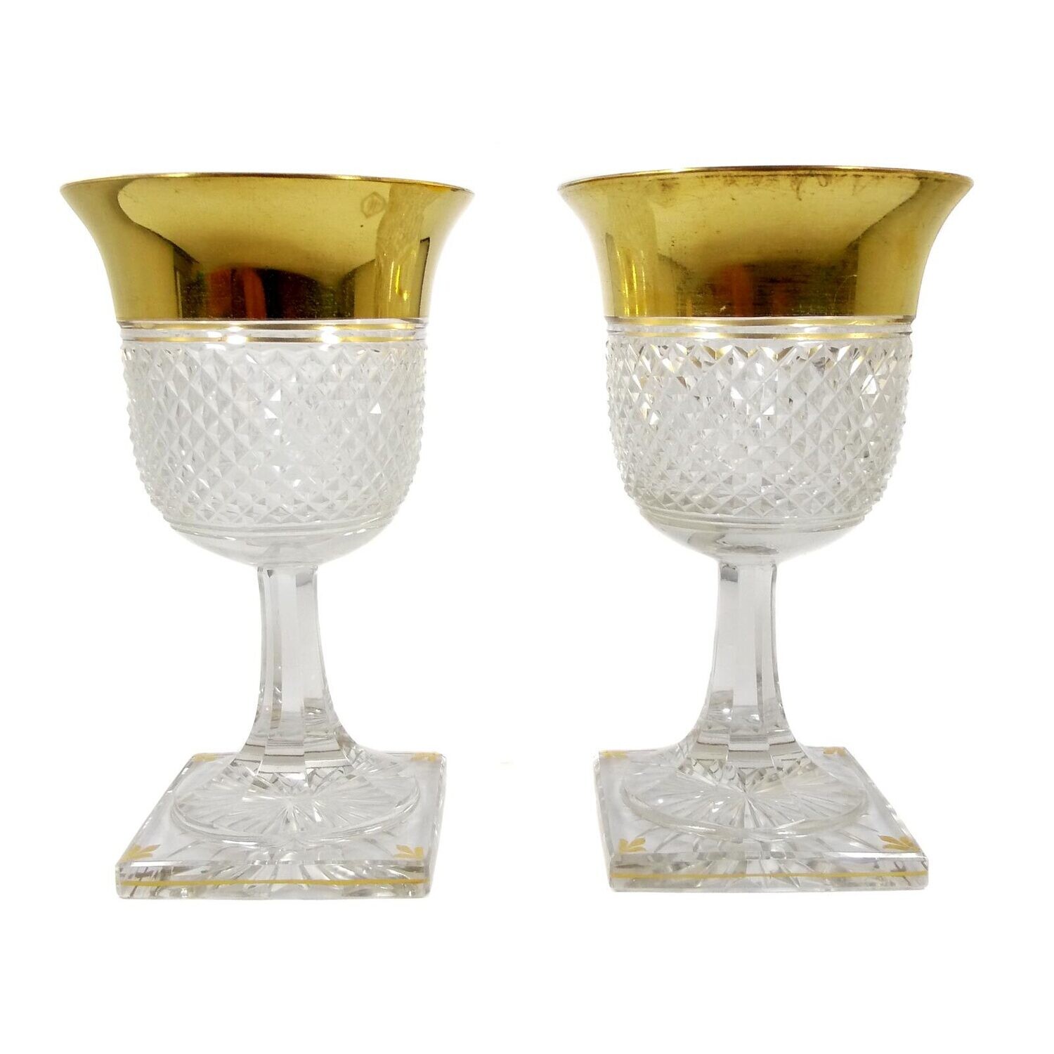 Cup made of colorless high-quality lead crystal, square plinth, faceted conical stem shaft, bell-shaped cup with brilliant cut and wide polished gold rim, polished underside of the plinth with base star rosette. Gold edge partially slightly rubbed. 1 glass with micro chip on the edge of the mouth. Count Schaffgotsche Josephinenhütte, around 1891-1923. Design by Franz Pohl Jr. Form 1357, ceremonial service Viktoria. Height: approx. 16.3 cm, diameter: approx. 9.8 cm. Lit: Stefania Zelasko, Josephinenhütte 1900-50, page 276. Item price per piece, only 1 x available