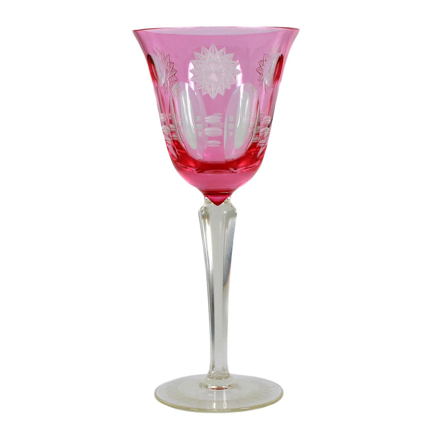 Stem glass made of colorless crystal glass, rising round base with decorative cut decoration on the base, hexagonal, faceted stem shaft, tulip-shaped cup with pink overlay, wall with sling star, balls and olive cut decoration, polished lip rim. Wine glass is in undamaged condition. Glassworks based in Saxony or Thuringia around 1940-50. Height: approx. 19.4 cm, diameter: approx. 8.8 cm.