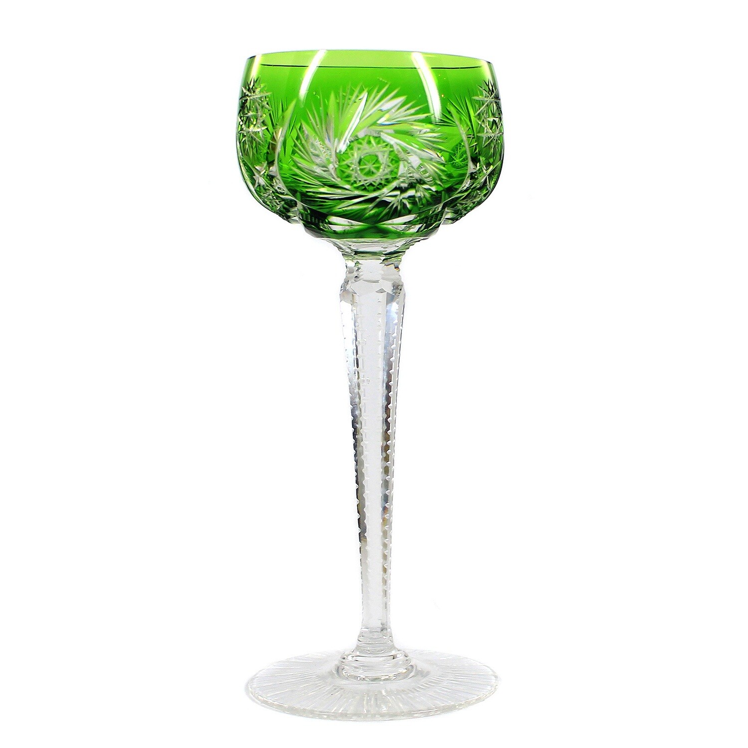Stem glass / overlaid Roman made of colorless crystal glass, disc base with wedge-cut decoration, conical, hexagonally faceted stem shaft notched on the sides, spherical, green overlaid and cut-decorated cup with a polished lip edge.Stem glass is in a healthy state.Josephinenhütte, design Siegfried Haertel, form 9828, section 1074, approx. 1928-35.Height: approx. 19.8 cm.Lit: Sample sheet from the glassworks